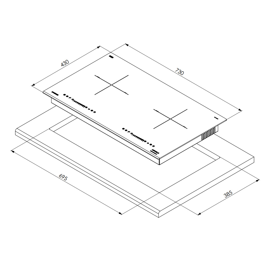 – Thiết kế vùng nấu từ dấu + và nét đứt sang trọng, vùng nấu điện vòng tròn nét liền và đứt