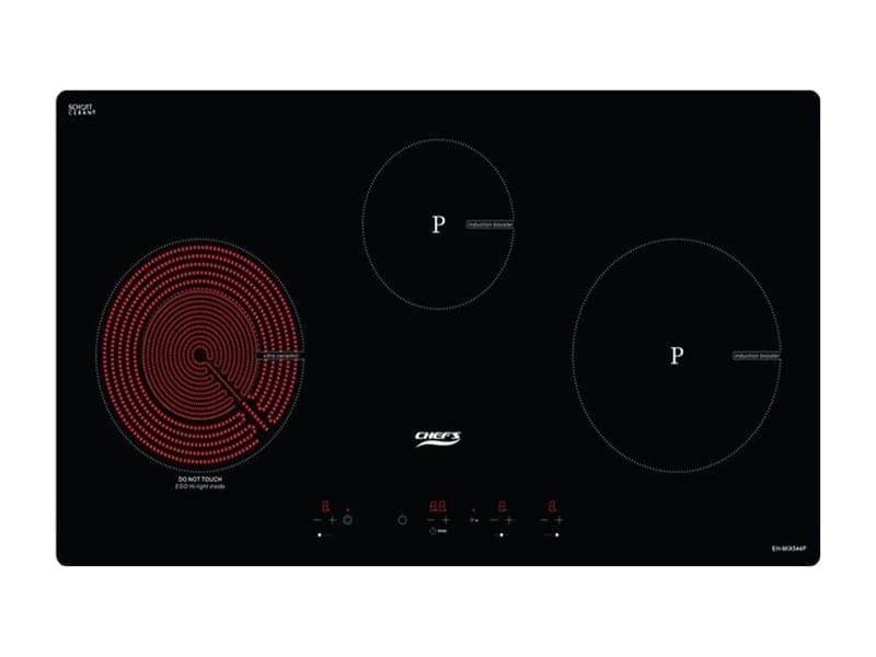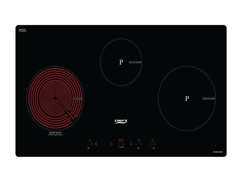 Bếp điện từ Chefs EH MIX 544P có kiểu dáng 3 bếp nối dài sang trọng có kích thước mặt kính dài 81cm x rộng 43cm x cao 6cm và kích thước khoét đá là 77.5cm x 40cm. Sự kết hợp 3 bếp gồm 1 bếp điện và 2 bếp từ cho phép người sử dụng đun nấu siêu nhanh, tiết kiệm thời gian đun nấu. Trong đó, vùng nấu từ nhỏ có kích thước 16cm với công suất 1600w, vùng nấu từ lớn có đường kính 22cm với công suất 1900w và công suất booster là 2000w và vùng nấu điện với cấu tạo 2 vòng nhiệt có công suất cao nhất là 2000w. Tổng công suất của Bếp điện từ Chefs EH MIX 544P là 5500w