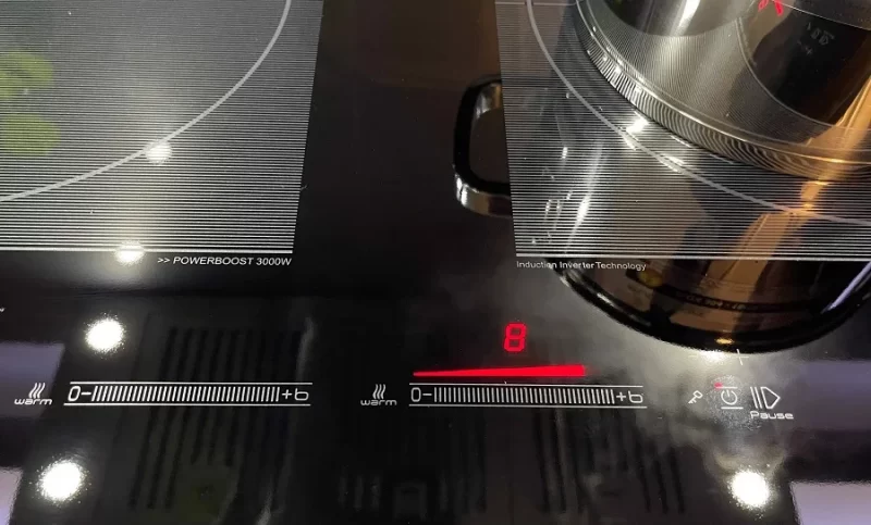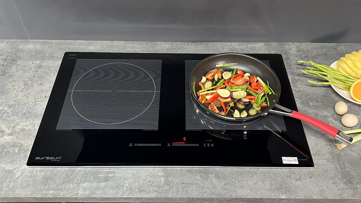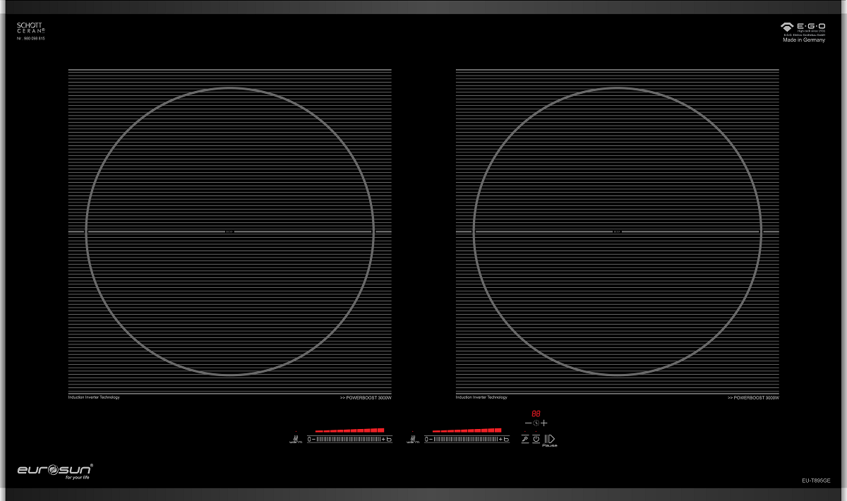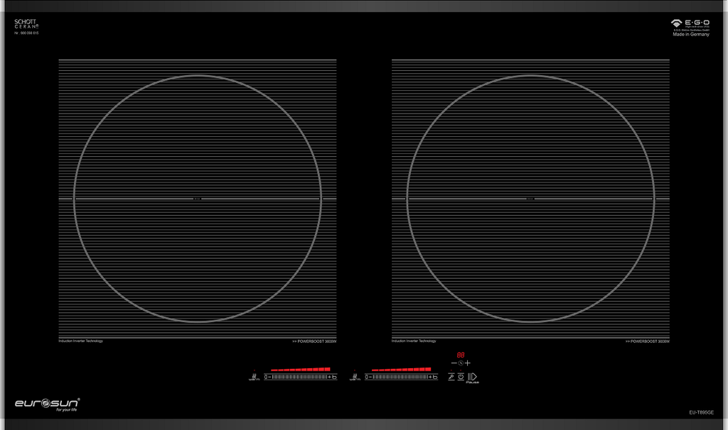 Tính năng chia sẻ công suất của hai vùng nấu tối đa 3600W: Khi một vùng nấu hoạt động ở mức công suất cao, các vùng nấu còn lại sẽ tự động điều chỉnh giảm để đảm bảo tổng công suất bếp không vượt quá 3600W, bảo vệ cho các thiết bị điện khác trong gia đình không bị quá tải đường dây.| Tên sản phẩm | Bếp từ EU-T895GE |