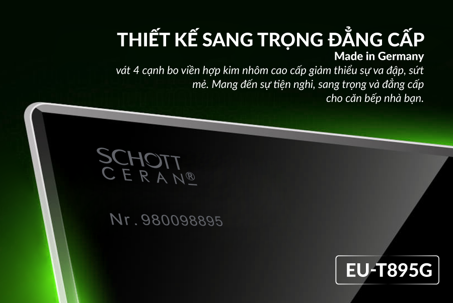 | Mặt kính | Kính SCHOTT Ceran vát 4 cạnh, bo viền nhôm |