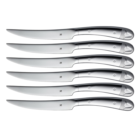 - Bộ dao Steak chuyên dụng WMF 6 món dễ sử dụng, thao tác dễ dàng. Lưỡi dao sắc bén hoàn hảo cho việc thưởng thức món Steak, thiết kế cạnh răng cưa vô cùng tinh tế.