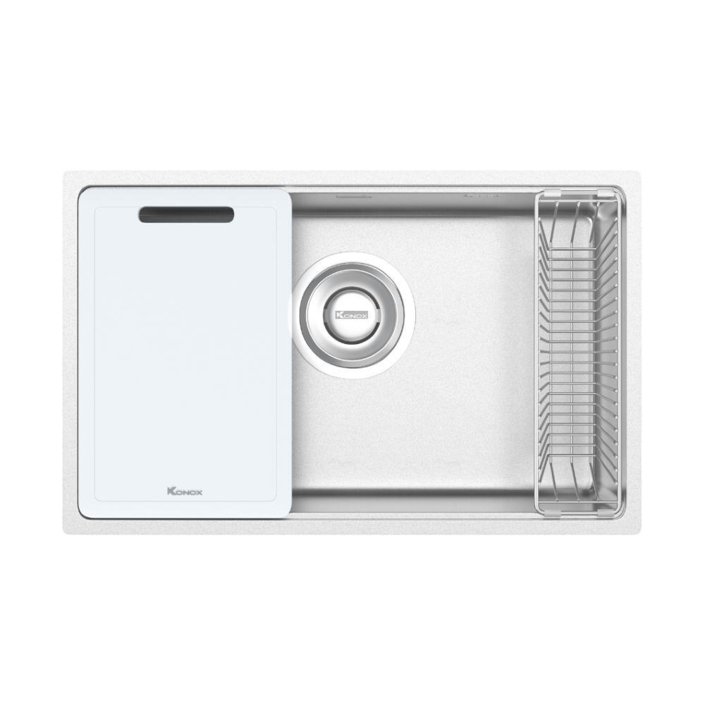Với model Tari 7648SR, Konox ra mắt bề mặt dập tạo hạt Linen chống xước với phiên bản hạt siêu nhỏ giúp tối ưu khả năng chống xước vượt bậc, giữ vững độ bền và thẩm mỹ theo thời gian. Sản phẩm tích hợp bộ phụ kiện tiện lợi, dễ sử dụng, đáp ứng nhu cầu sử dụng bồn rửa cơ bản.