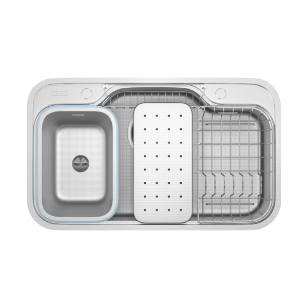 - Thiết kế hiện đại với gờ hạ bậc – tích hợp phụ kiện thông minh: Siphon, giá úp bát inox, chậu rửa nhỏ, thớt inox lỗ, rổ phụ gắn thành chậu