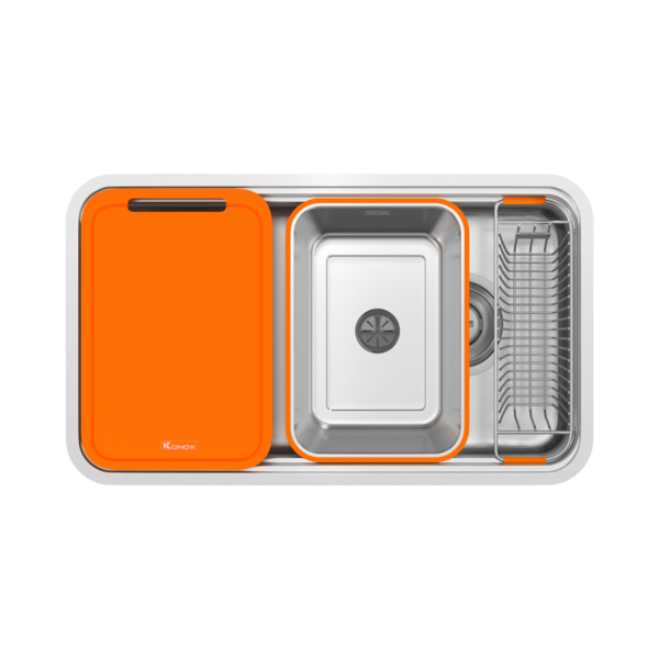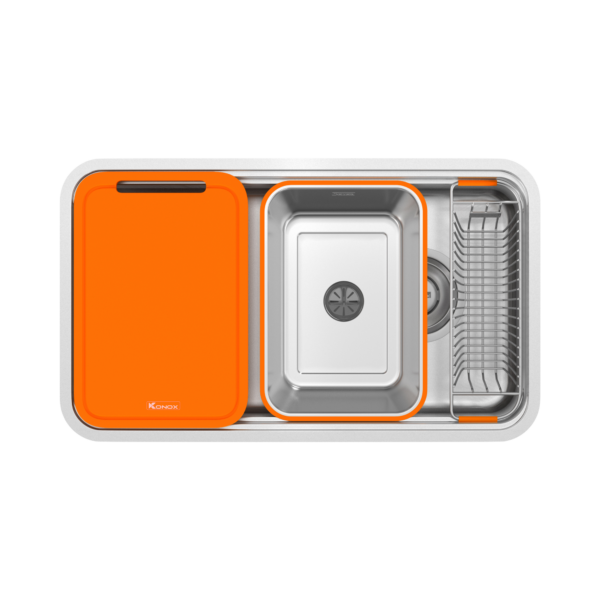 - Tích hợp phụ kiện đáp ứng đủ tiêu chí sử dụng hàng ngày của người nội trợ: thớt nhựa cam, colander và rổ phụ.