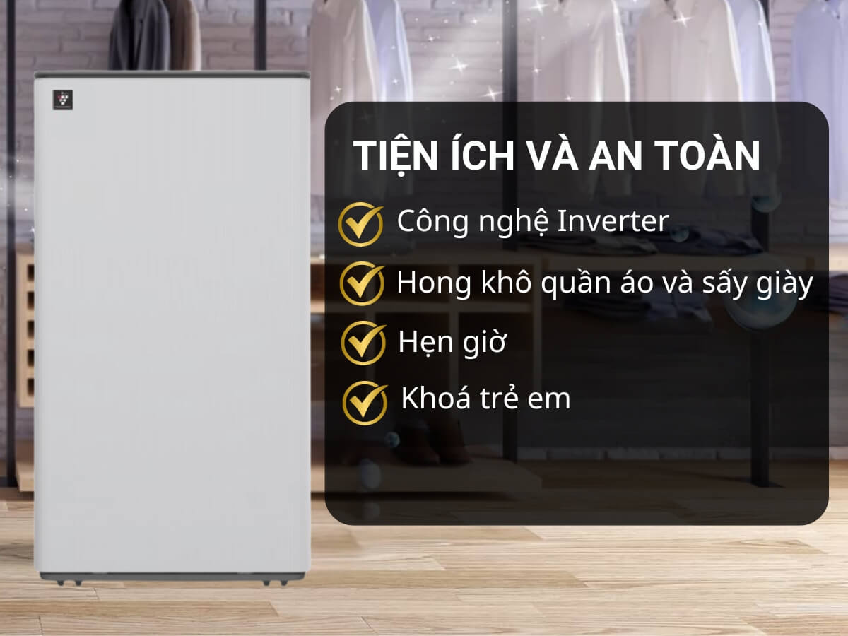 Mẫu máy hút ẩm này của Sharp không chỉ giúp kiểm soát độ ẩm mà còn tích hợp chế độ sấy khô quần áo nhanh chóng, giúp quần áo khô ráo chỉ trong 75 phút. Đây là tính năng cực kỳ hữu ích vào những ngày mưa ẩm, khi quần áo lâu khô, dễ có mùi hôi. Chỉ cần bật chế độ sấy, máy sẽ làm khô quần áo theo cơ chế hút bỏ độ ẩm và hơi nước, giúp quần áo được lấy đi toàn bộ hơi ẩm, sẽ trở nên khô ráo như phơi dưới trời nắng mà không làm hỏng sợi vải. Tiện lợi, tiết kiệm thời gian, giữ cho quần áo luôn thơm tho, sẵn sàng cho mọi hoạt động!