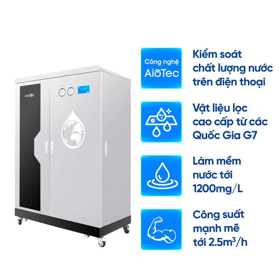 Karofi KTF-662 AIO có công suất xử lý nước đầu nguồn lên tới 2.5 m3/h, khả năng làm mềm nước lên tới 1200 mg/L, đáp ứng mọi nhu cầu sử dụng của gia đình.