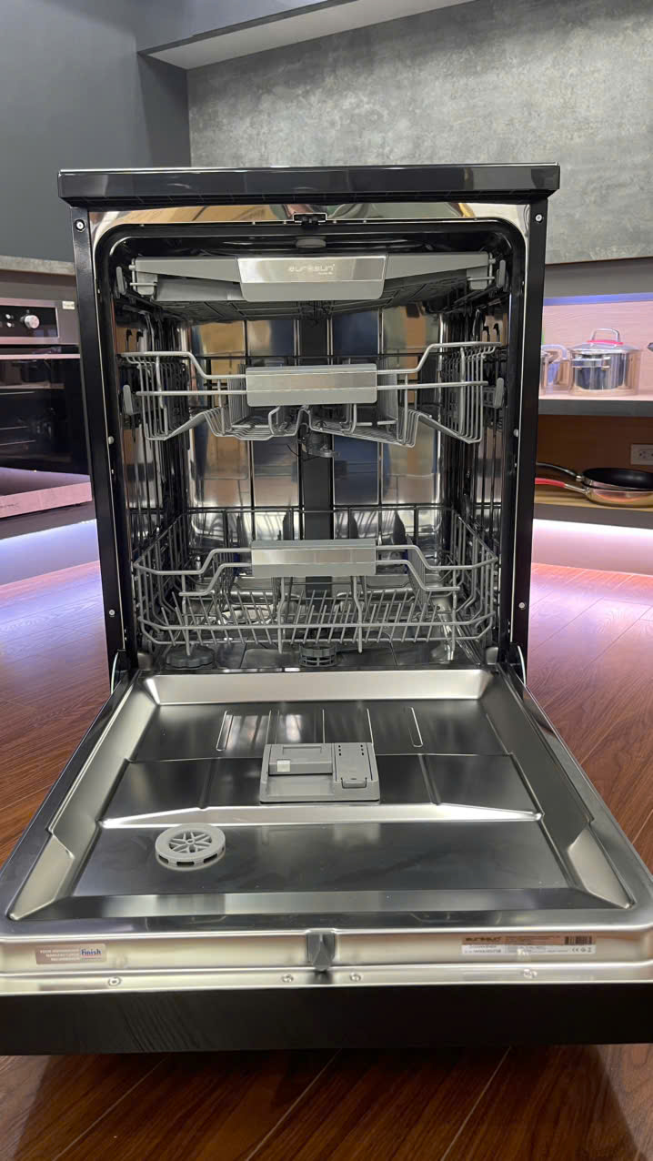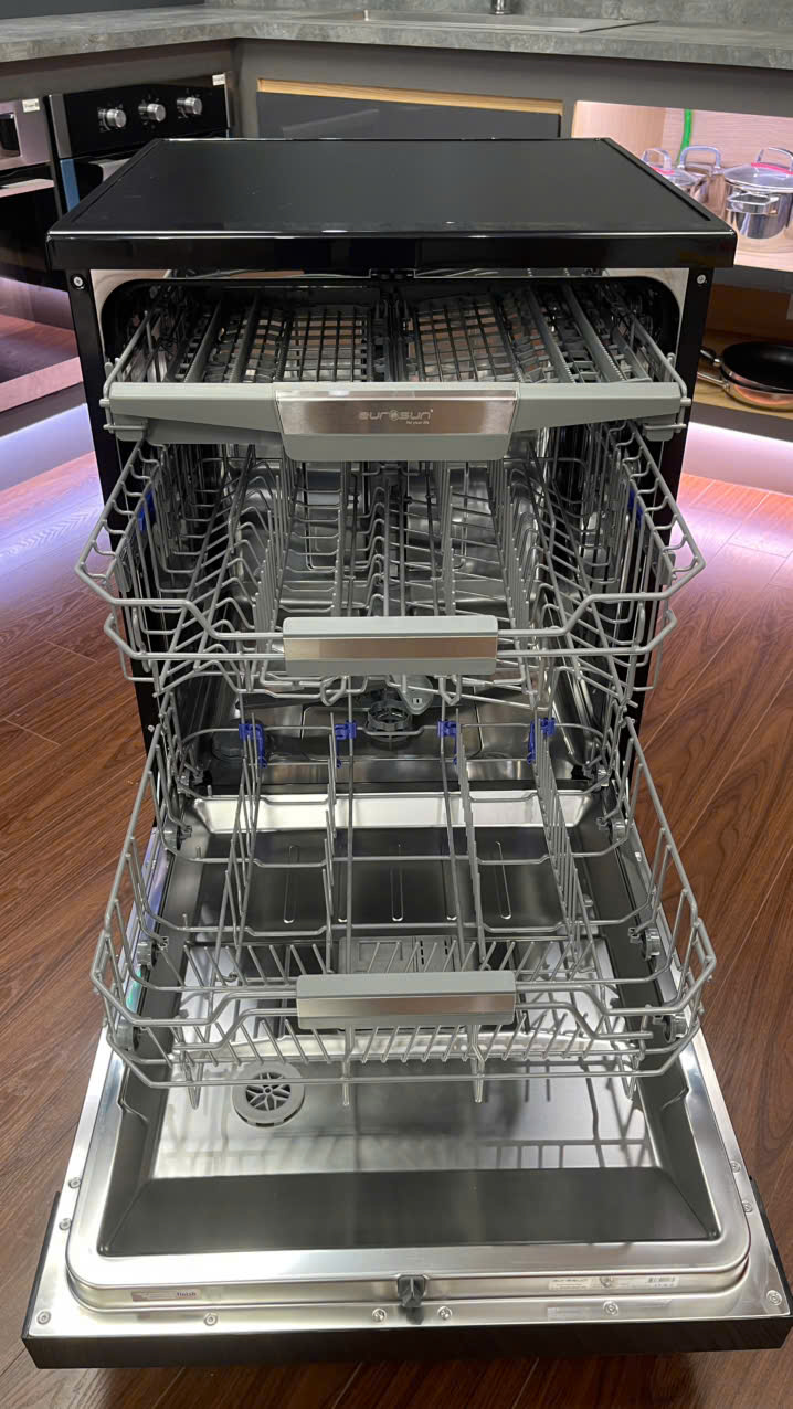 Máy rửa bát lắp độc lập thế hệ mới. 3 khay chứa cơ động IEC New Basket chuẩn âu+ giỏ để đũa. Ray nâng hạ Vario space thông minh thay đổi chiều cao giữa các khay. Khay xếp bát đĩa đã được Eurosun nghiên cứu và thiết kế chuyên dụng dành riêng cho thị trường Châu Á chắc chắn và dễ sử dụng. Hệ thống khay rửa (giàn rửa) có thể kéo ra dễ dàng rất thuận tiện cho việc sắp xếp đồ vào máy.