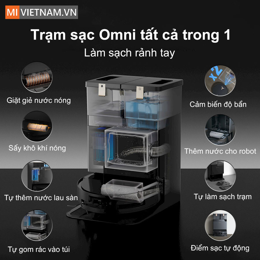 Một điểm nhấn quan trọng của trạm sạc OMNI là tính năng tự giặt khăn lau bằng nước nóng 63°C và sấy khô khăn lau. Nhờ vậy, khăn lau luôn được làm sạch kỹ lưỡng, không lo lắng về vi khuẩn hoặc nhiễm bẩn chéo. Bạn cũng sẽ không cần phải tự tay giặt khăn lau, giúp tối ưu hóa công việc làm sạch và mang lại sự an tâm tuyệt đối trong quá trình sử dụng.