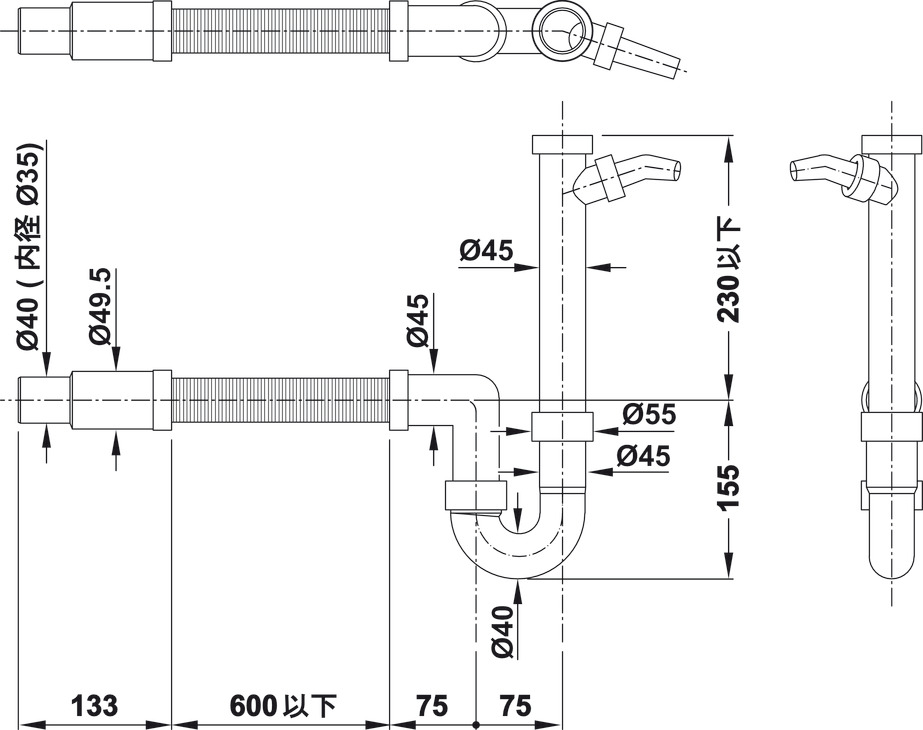 Với kết nối linh hoạt - hình ống - với kết nối 40 và 50 mm