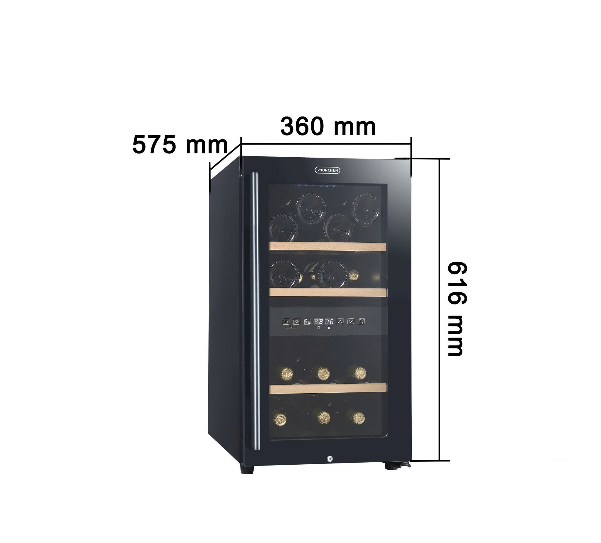 Tủ rượu vang Munchen MW160PRO (~16 chai) có thiết kế dạng tủ đứng nhỏ gọn, cửa kính 3 lớp chống tia UV và các kệ gỗ sồi bên trong. Màn hình cảm ứng phía trên cửa hiển thị hai vùng nhiệt độ riêng biệt (trên và dưới) cho phép người dùng dễ dàng theo dõi, điều chỉnh. Tông màu đen sang trọng của tủ giúp MW160PRO hài hòa với nhiều không gian nội thất, làm tôn lên vẻ đẳng cấp của góc trưng bày rượu.