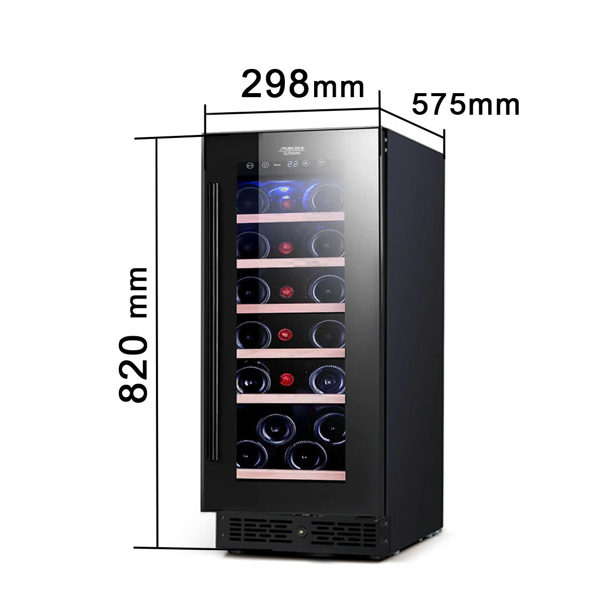 Munchen MW22BHT được trang bị bảng điều khiển hiện đại giúp người dùng dễ dàng theo dõi và điều chỉnh các thông số. Bảng điều khiển cảm ứng được bố trí ngay phía trên, hiển thị nhiệt độ bằng màn hình LED rõ ràng. Bạn có thể tăng giảm nhiệt độ mong muốn chỉ bằng vài thao tác chạm nhẹ. Phạm vi nhiệt độ điều chỉnh rộng (thông thường từ 5°C đến 18°C) cho phép bảo quản nhiều loại rượu vang khác nhau ở chế độ thích hợp. Ngoài ra, bảng điều khiển còn có nút bật/tắt đèn LED nội thất để bạn có thể chiếu sáng tủ khi cần trưng bày rượu, hoặc tắt đi để tiết kiệm điện. Tính năng khóa trẻ em (khóa bảng điều khiển) cũng được tích hợp, giúp ngăn điều chỉnh ngoài ý muốn – rất hữu ích khi gia đình có trẻ nhỏ hoặc khi bạn muốn cố định thiết lập nhiệt độ. Các phím chạm nhạy và bố trí trực quan, kết hợp màn hình hiển thị sắc nét, đảm bảo rằng việc cài đặt tủ rượu vang trở nên đơn giản và chính xác với mọi người dùng.
