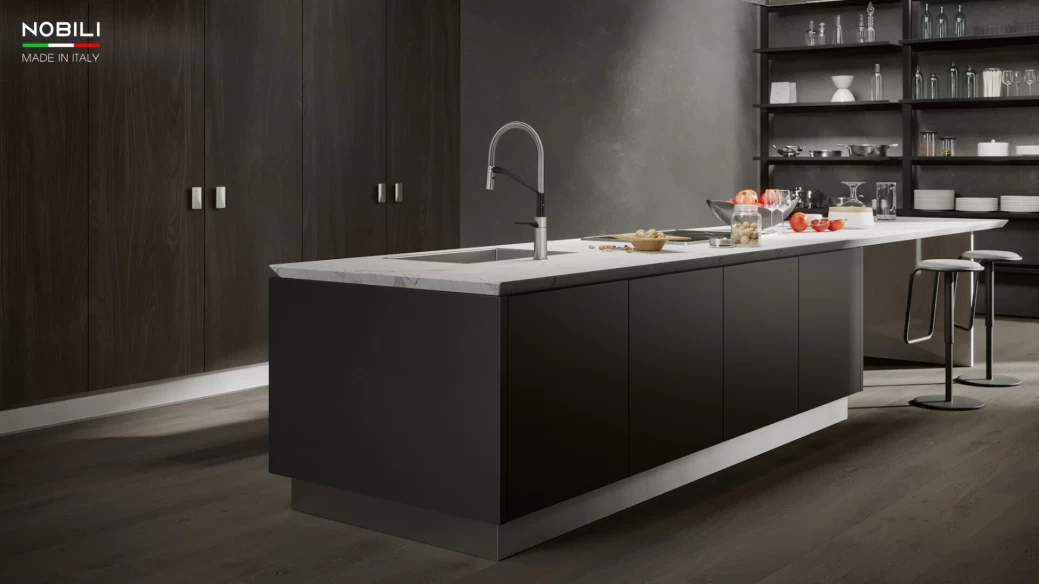 Tay vòi ngang di chuyển mượt mà, linh hoạt, tối ưu không gian bàn bếp.