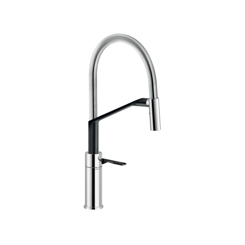 Thiết kế đầu vòi cong bằng lò xo tạo sự thanh lịch kết hợp tay cầm điều chỉnh 2 tia nước ( chế độ mưa, chế độ phun ) di chuyển tự do trong quá trình làm bếp.